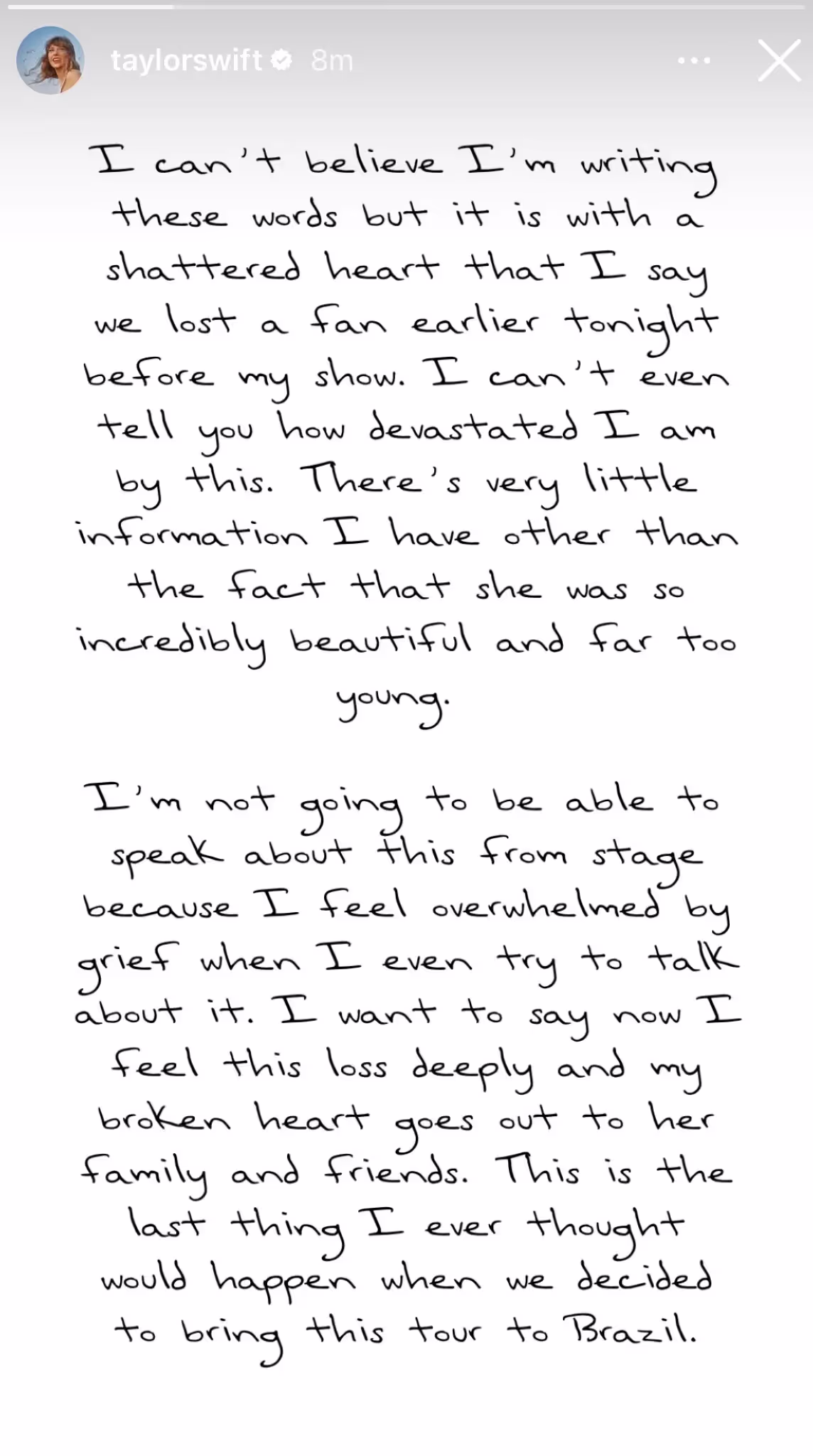 I'm not going to be able to speak about this from stage because I feel overwhelmed by grief when I even talk abut it. I want to say now I feel this loss deeply and my broken heart goes out to her family and friends. This is the last thing I ever thought would happen when we decided to bring this tour to Brazil."