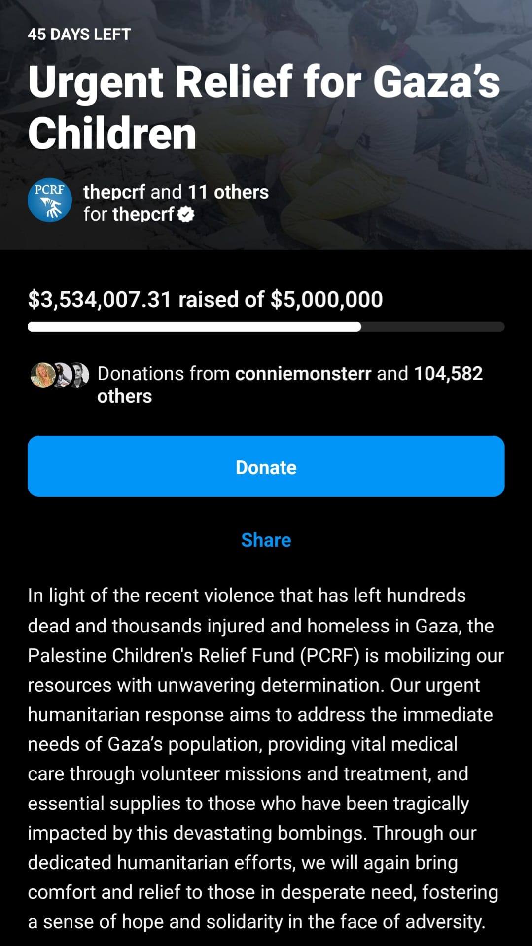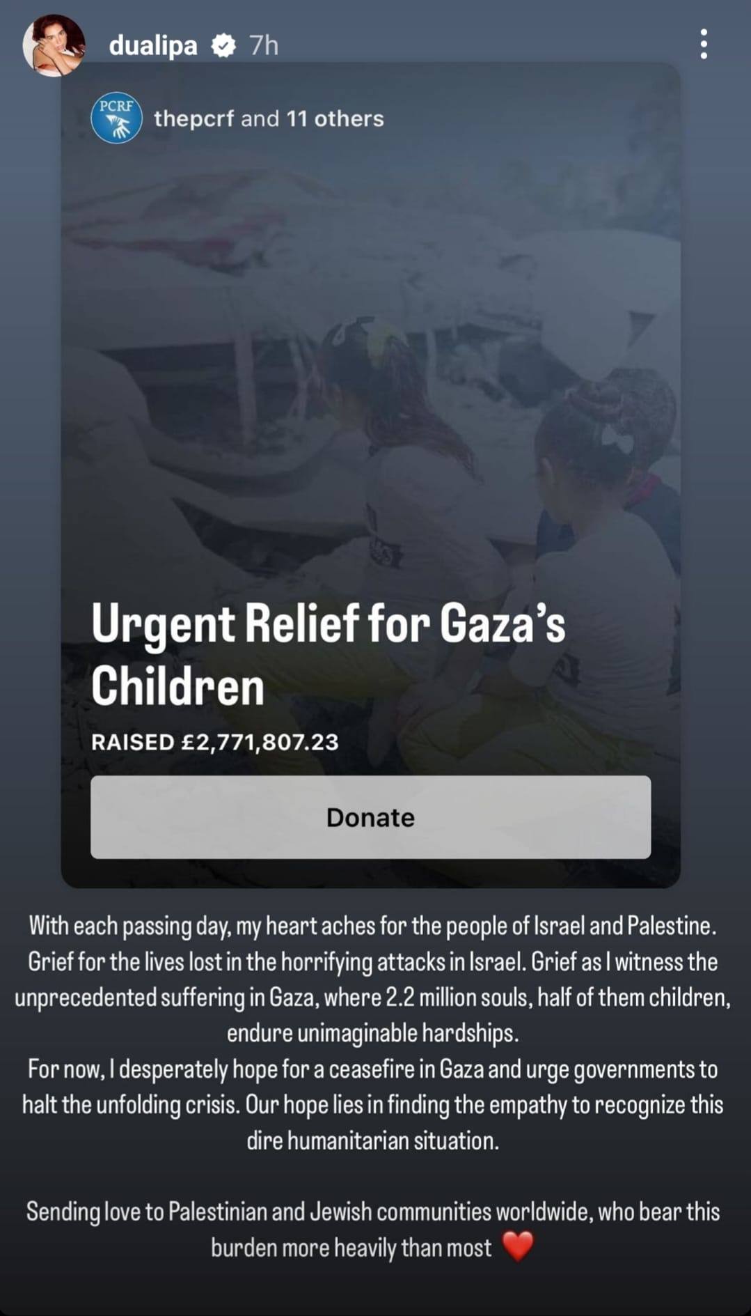 Alongside her message, Dua Lipa shared a campaign by the Palestine Children’s Relief Fund (PCRF). The campaign, titled “Urgent Relief for Gaza’s Children,” aims to raise $5 million and has collected $3.5 million so far.