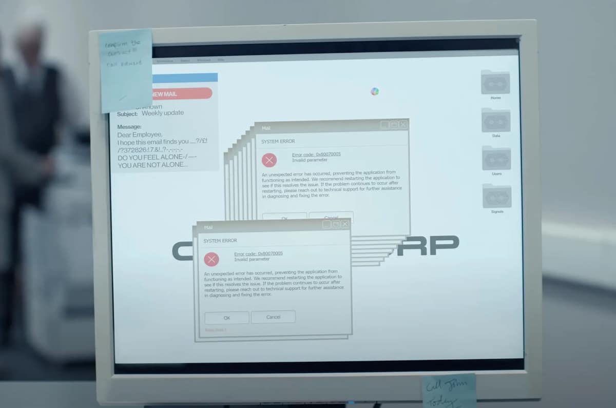 It opens with FKA Twigs sporting a dark pixie haircut, neutral makeup, and a striped suit—stripped of her identity and blending into a sterile office environment. Her look is designed to erase any individuality, portraying her as a cog in the corporate machine. The transformation begins when she receives an email from an unknown sender, reading: "Dear employee, I hope this email finds you... ?... DO YOU FEEL ALONE - /--- YOU ARE NOT ALONE..." As the computer displays system errors, the environment destabilizes, marking the onset of her liberation.