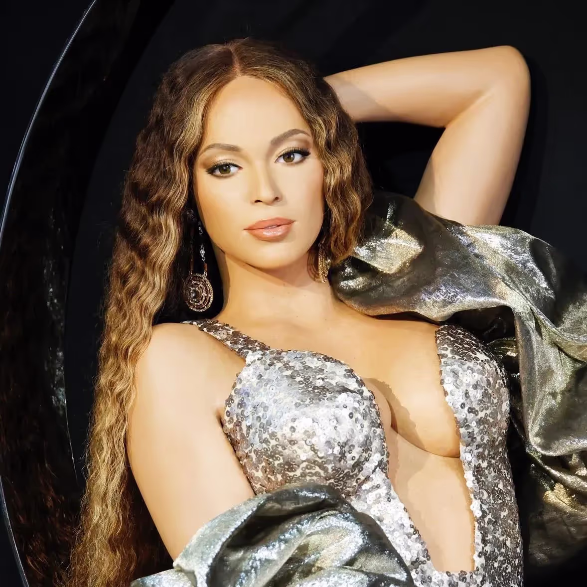 The wax figure is dressed in a sparkling, low-cut silver bodysuit, paired with rhinestone-encrusted fishnet tights and a silver shawl draped over its arms. This outfit appears inspired by the metallic looks Beyoncé has worn during her Renaissance tour. The figure’s long brown wig is styled in a classic crimped look, and the makeup features a smoky eye.
