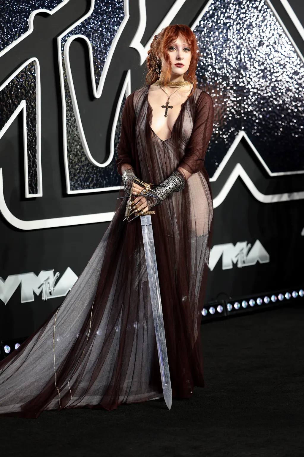 Taylor Swift turned heads in a Vivienne Westwood corset dress, perfectly complemented by thigh-high boots. Swift, who leads the night with ten nominations, brought sophistication with a modern edge. Chappell Roan, on the other hand, went for an avant-garde look with a sheer maxi dress and cloak, accessorizing with a sword that channeled a medieval warrior vibe.