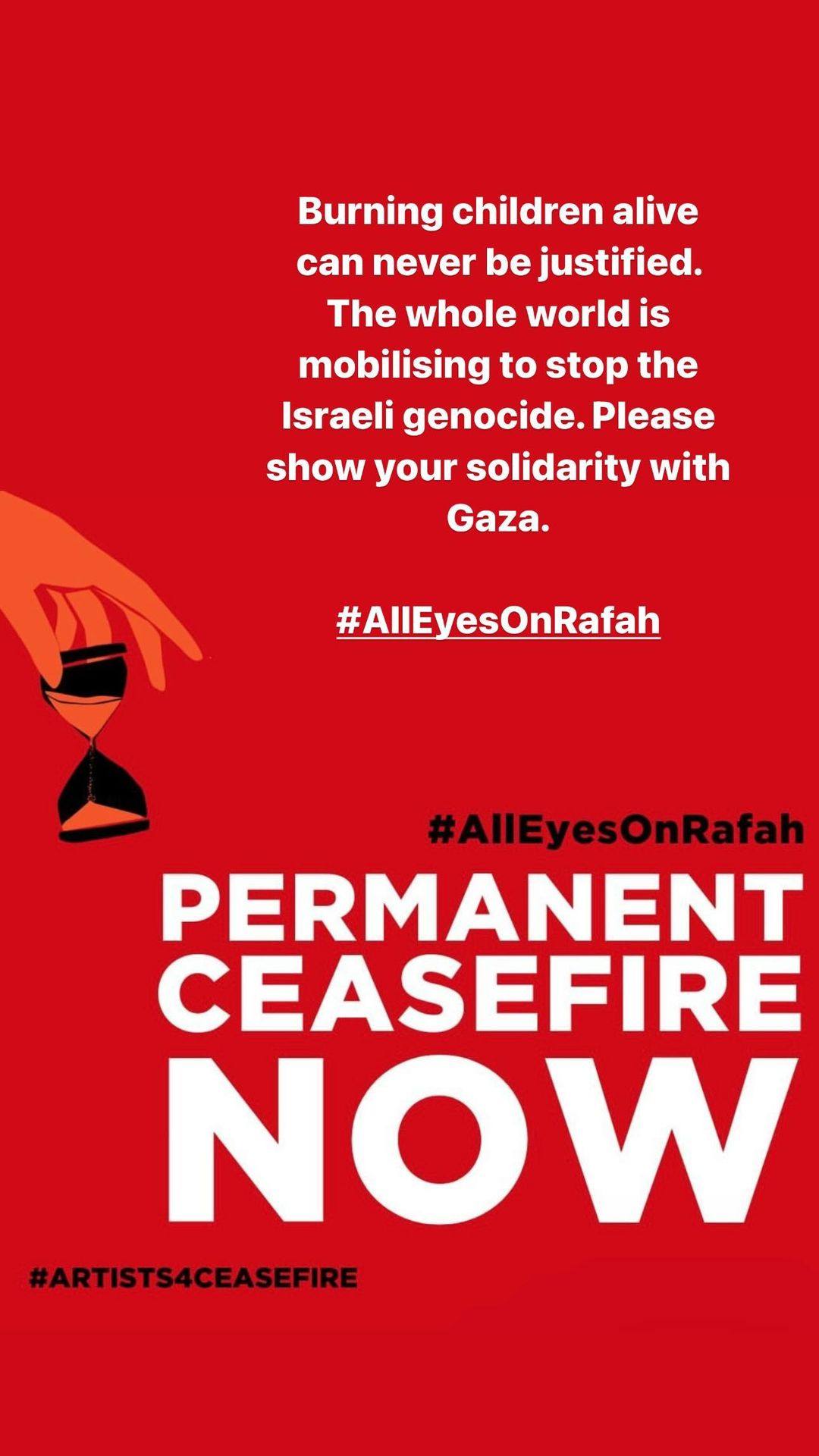 On Tuesday (May 28), the pop star took to Instagram to share an Artists for Ceasefire graphic, accompanied by the hashtag “#AllEyesOnRafah” and a poignant message: “Burning children alive can never be justified.”