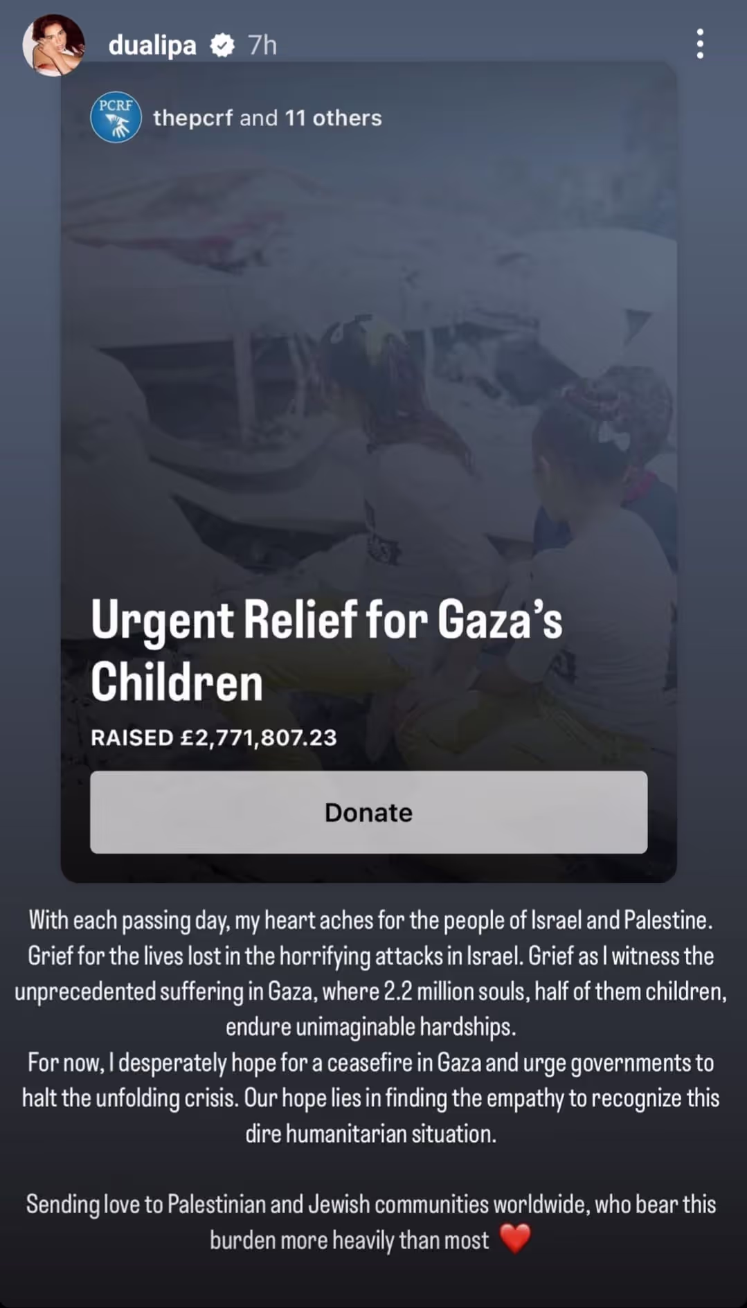 Alongside her message, Dua Lipa shared a campaign by the Palestine Children’s Relief Fund (PCRF). The campaign, titled “Urgent Relief for Gaza’s Children,” aims to raise $5 million and has collected $3.5 million so far.