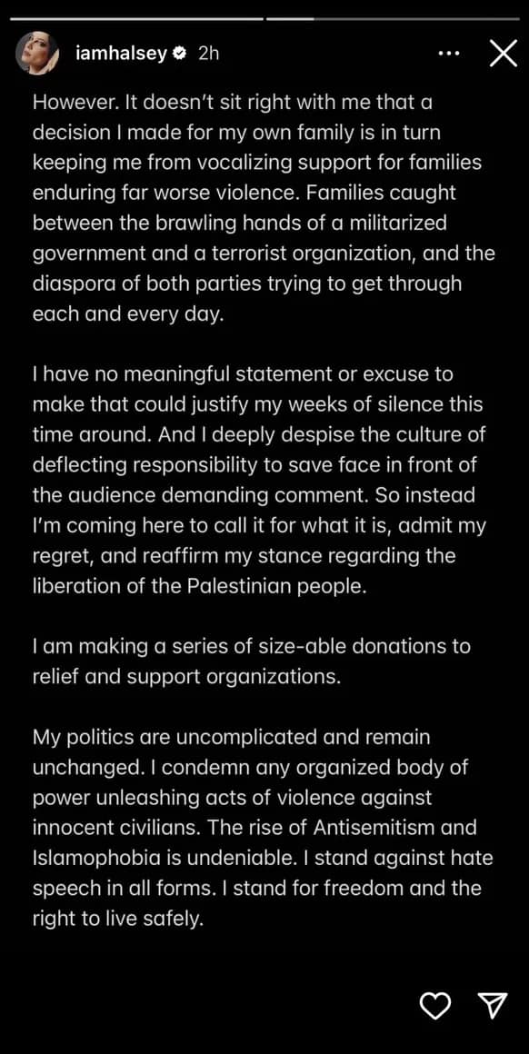 I have no meaningful statement or excuse to make that could justify my weeks of silence this time around. And I deeply despise the culture of deflecting responsibility to save face in front of the audience demanding comment. So instead I'm coming here to call it for what it is, admit my regret and reaffirm my stance regarding the liberation of the Palestinian people.