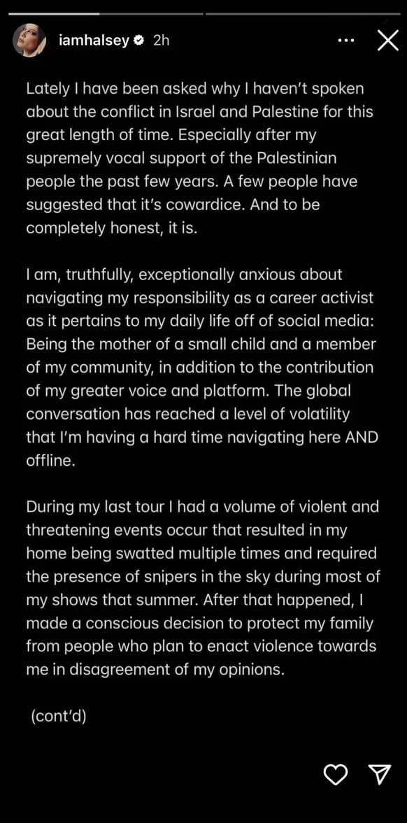 Halsey has responded to those who criticized her for cowardice and remaining silent on the Israeli-Palestinian conflict. In her recent Instagram post, the American singer denounced violence and emphasized her dedication to freedom and safety for everyone.