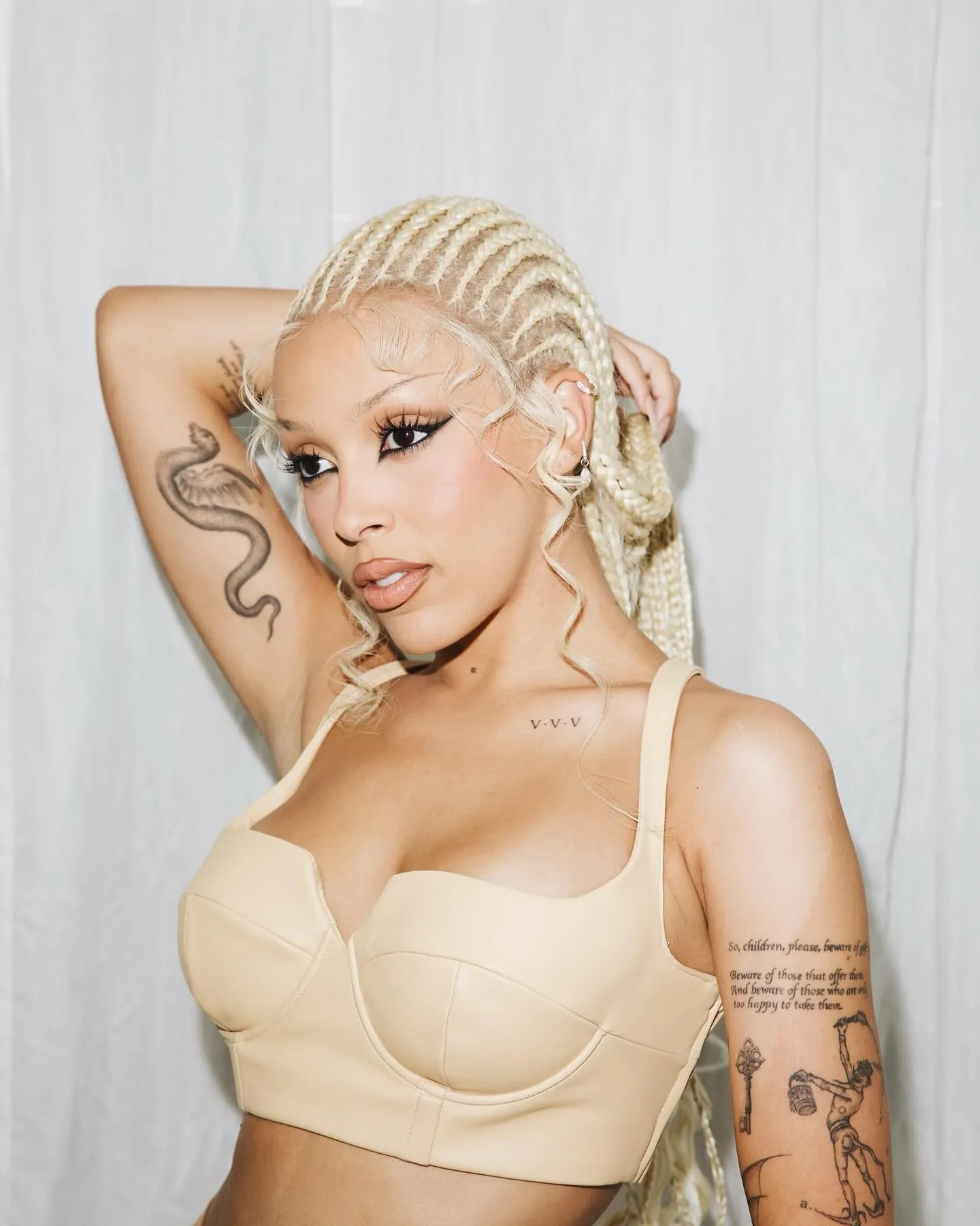 Doja Cat, yang dikenal karena gaya busuk dan keberagaman artistiknya, membagikan set foto baru di Instagram, menarik perhatian penggemarnya dengan penampilan segar dan menakjubkan. Dalam foto-foto ini, dia mengenakan bralet kulit krim, tights ikan berwarna nude, dan mini skirt kulit yang sesuai. Rambut blonde-nya digaya menjadi ikatan, dengan beberapa helai keriting jatuh longgar, memberikan penampilan hampir etereal yang mirip dengan Daenerys Targaryen.