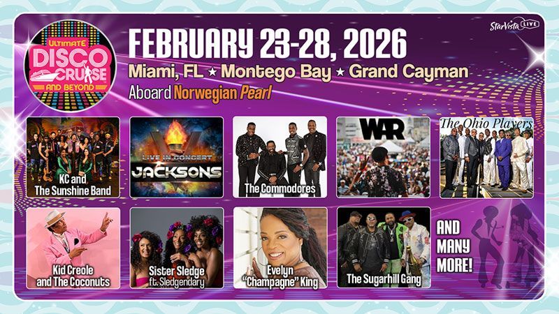 The Commodores and The Three Degrees join the 2026 Ultimate Disco Cruise and Beyond lineup, sailing February 23–28 aboard the Norwegian Pearl with over 40 legendary acts.