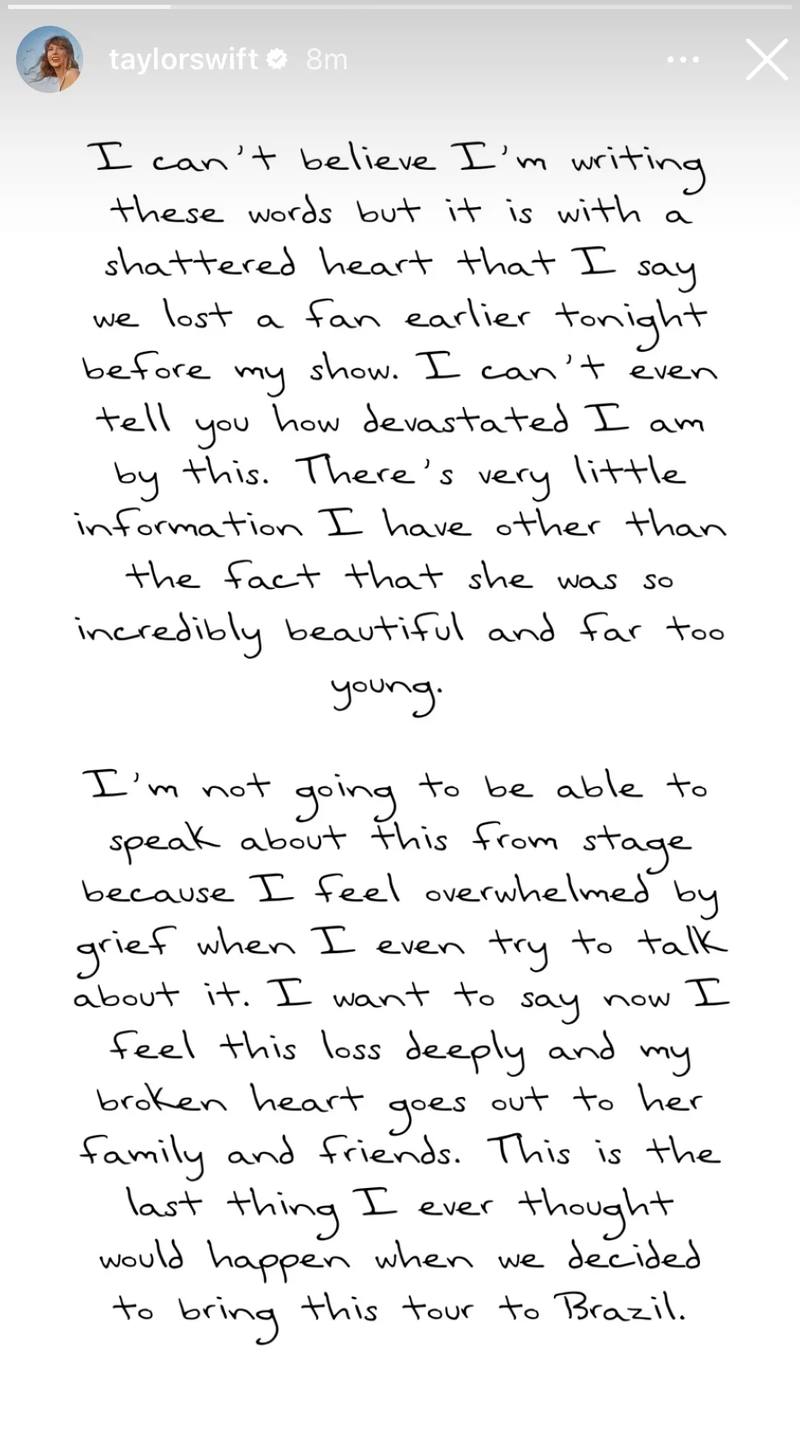 ان کی انسٹاگرام اسٹوری پر شیئر کیے گئے ایک دل دہلا دینے والے نوٹ میں، Taylor Swift اس نقصان پر گہرے دکھ کا اظہار کیا۔